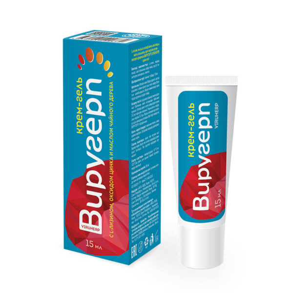 ВИРУГЕРП (VIRUHERP) крем-гель с L-лизином, оксидом цинка и маслом чайного дерева для ухода за кожей губ способствуют снижению дискомфорта при появлении простуды на губах и создает на коже защитную пленку.