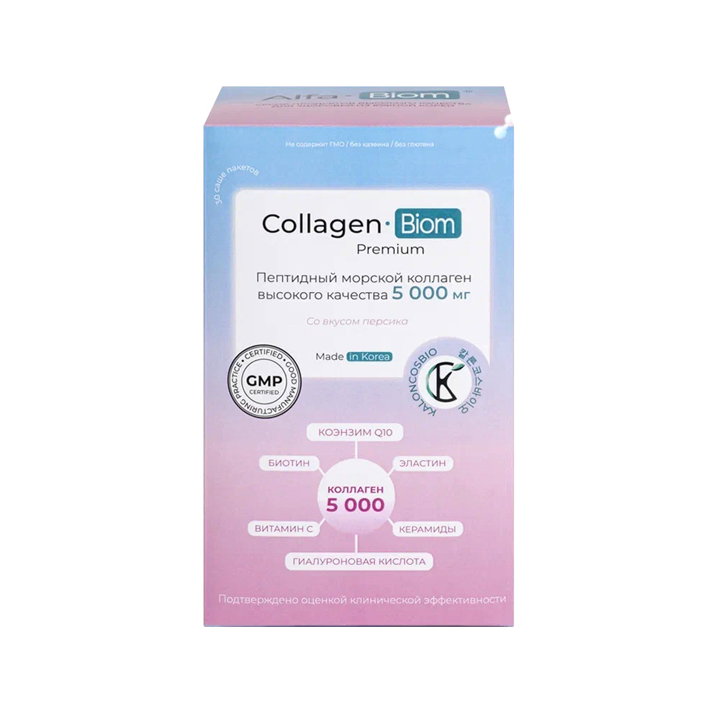 Alfa Collagen-Biom Premium (Альфа Коллаген Биом Премиум) -мы позаботились о том, чтобы пептиды коллагена были усвоены правильно любым организмом, поэтому вместе с 5000 мг действующего вещества вы получаете необходимые кофакторы: пролин, гиалуроновую кислоту, коэнзим Q10, биотин, витамин С, керамиды, эластин.