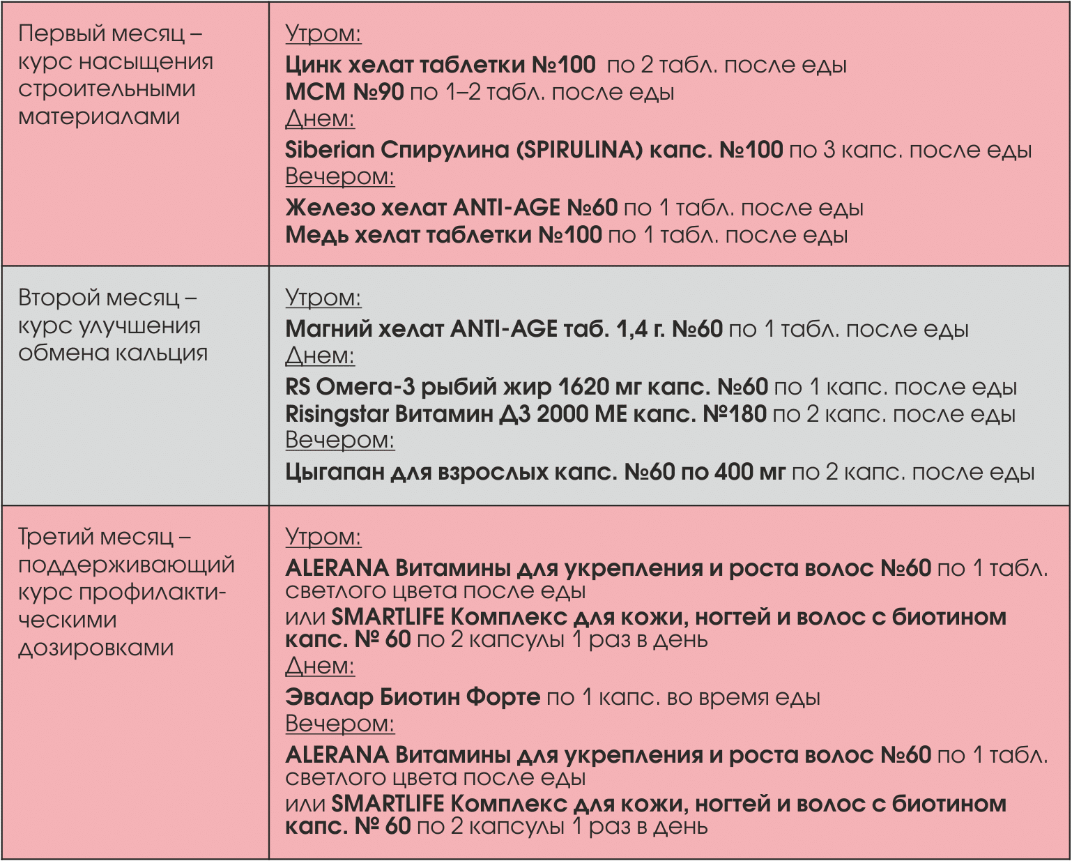 Спирулина — содержит набор аминокислот необходимых для роста волос, высокое содержание витамин (B12, фолиевая) способствуют поддержанию нормального уровня гемоглобина.